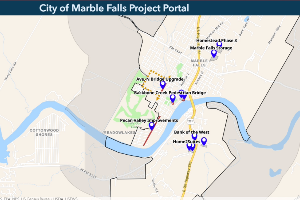 The project portal is a collaboration between the Marble Falls Public Relations Office, Marketing Department, City Engineer’s Office, and Development Services.