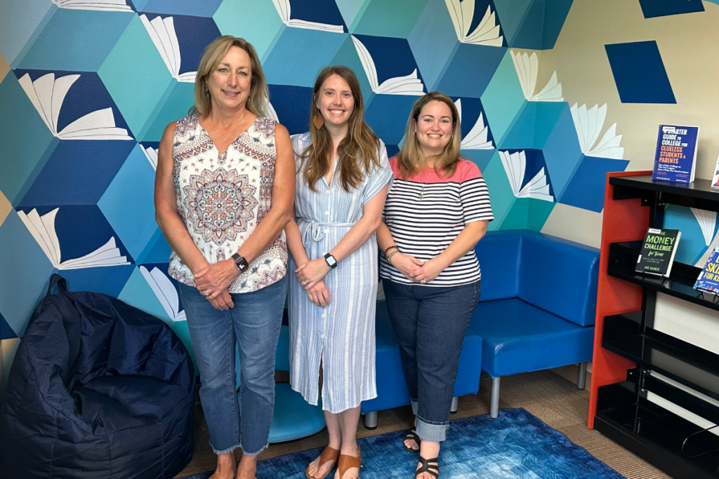 Showing off a new reading area for tweens in the Bertram Library are Assistant Director and Children’s Librarian Schalean Druell, library Director Mary Seaman, and part-time library technician Lisa Haley. Not pictured from the four-person staff is part-time library technician Bethany Akers. The flying book mural was recently painted by local artists Sara and Topher Mack of Artist Couple in Bertram. Staff photo by Suzanne Freeman
