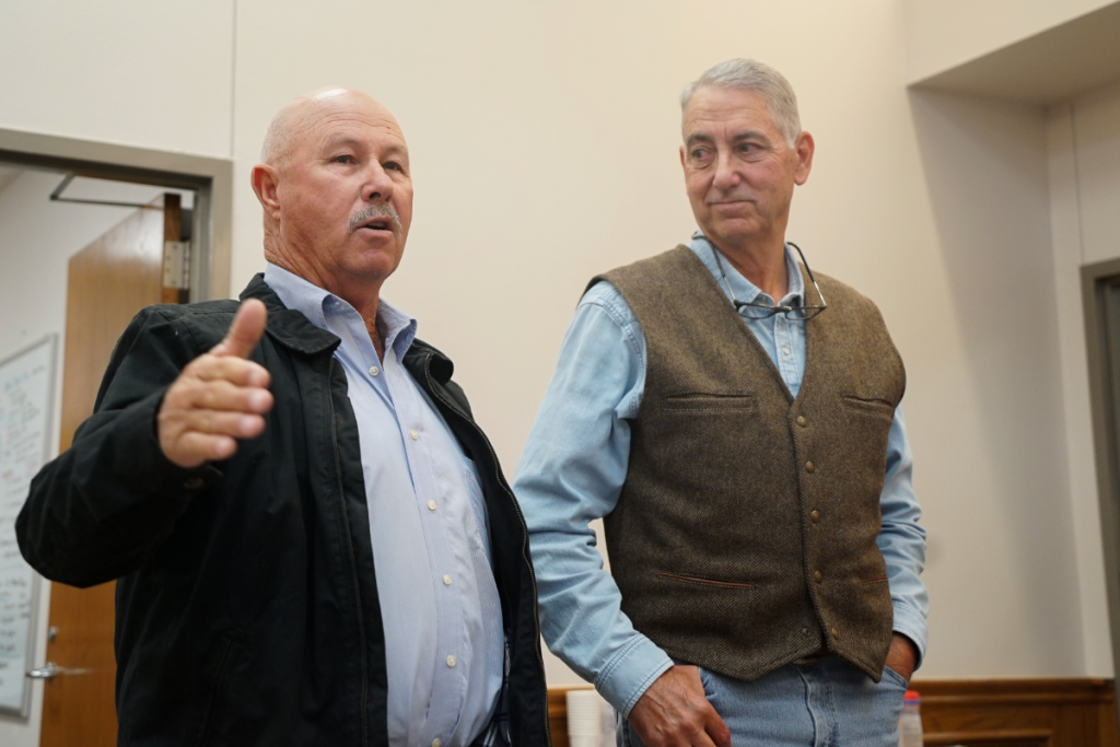 Representatives from the Llano County Soil and Water Conservation District presented a resolution to the Commissioners Court on Monday that would put the county in opposition to a proposed, massive state transmission line project that would cut through Central Texas. Secretary Joe Freeman (left) makes an impassioned speech beside Chairman Steve Haverlah. The resolution was ultimately passed. Staff photo by Dakota Morrissiey