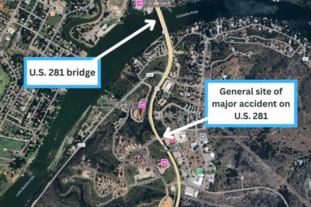 U.S. 281 was shut down for about three hours following the collisions to accommodate damage control, a criminal investigation, and the landing of two different helicopters to transport the reckless driver and Ashlock’s three-year-old daughter to hospitals. During the shutdown, travel across Marble Falls was extremely hindered, leading to one-hour-plus drive times to cross town.