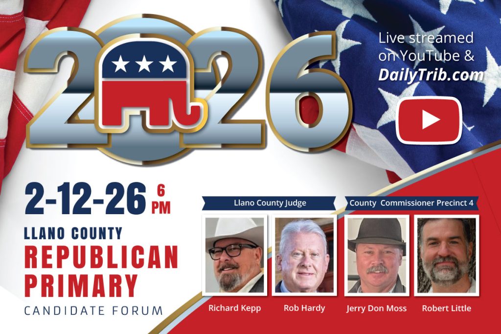 The 2026 DailyTrib Llano County Republican Primary Candidates Forum is scheduled for 6-7 p.m. on Thursday, Feb. 12, at the Llano County Community Center, 2340 W. Haynie Street in Llano. The forum is open to the public and will also be livestreamed on the DailyTrib Youtube channel for concurrent and later viewing.