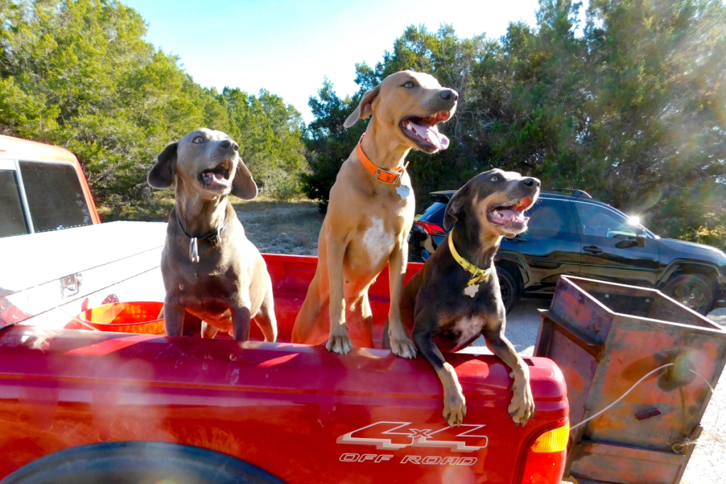 Jax (left), Stevie, and Charlie in the back of Andy Lyda’s working ranch truck on the Lyda Ranch in Bertram. Jax is about 8 years old and a true-blue Lacy Hog Dog, owned by Andy. His son, Ethan Lyda, owns Stevie and Charlie. Stevie is a yellow Lacy; Charlie is a tri-color.