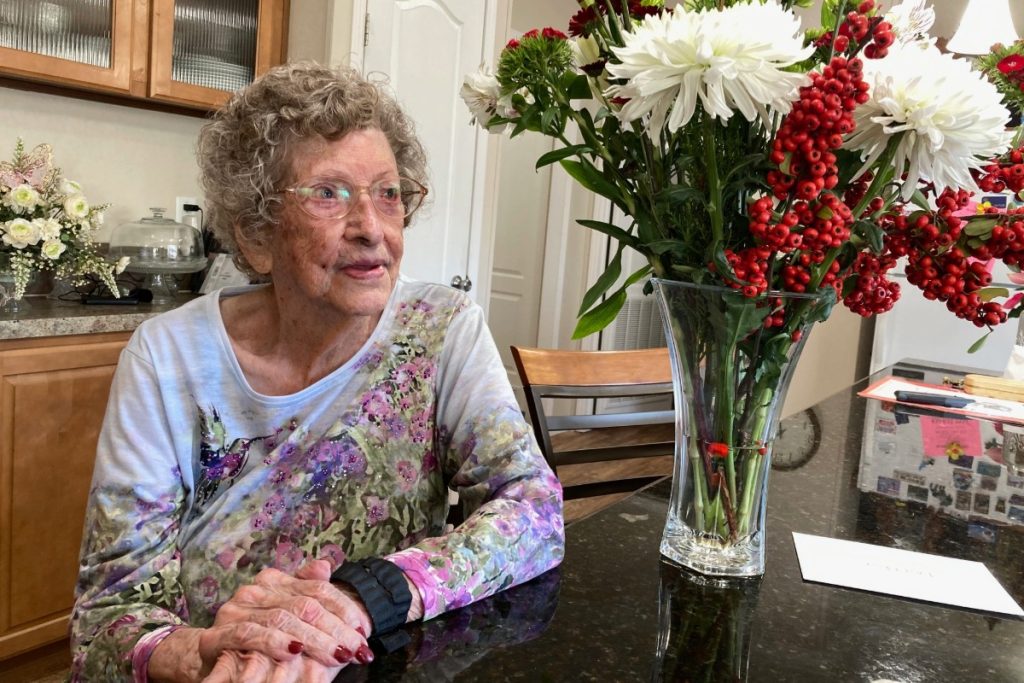 Dortha Bittle with a bouquet of flowers given to her for her 105th birthday on Dec. 19, 2025. Bittle is a Spicewood native, a supporter of the Spicewood Community Library, and a former FBI employee and private investigator. Courtesy photo by Preston Kirk