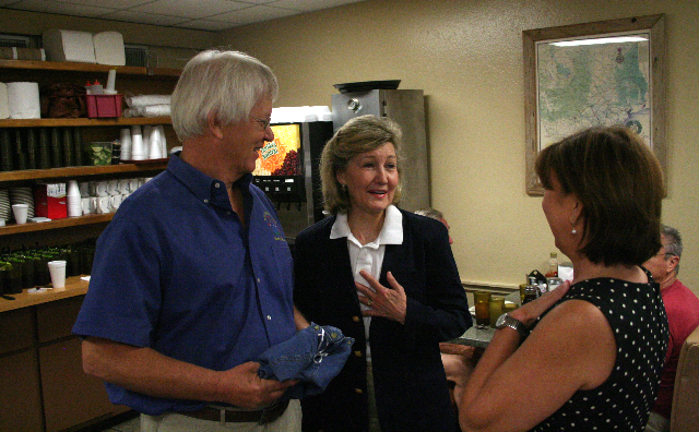 PHOTO: John Kemper (left), co-owner of the Blue Bonnet Cafe in Marble Falls, speaks with U.S. Sen. Kay Bailey Hutchison (center) and Burnet County Judge Donna Klaeger on June 30, as the senator greeted constituents at the cafe. Staff photo by Jared Fields